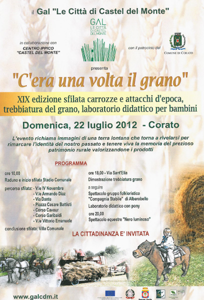 Il Gal “Le Città di Castel del Monte”, con il patrocinio del Comune di Corato e in collaborazione con il Centro Ippico “Castel del Monte” organizza quest’anno “C’era una volta il grano”, manifestazione dedicata alla tradizionale rievocazione delle attività di trebbiatura del grano, ma non solo.