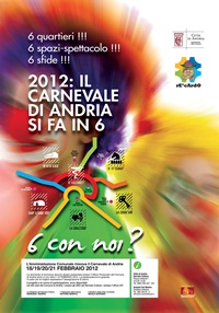 Numerose le novità del Carnevale Andriese che prevede sei “spazi-spettacolo”, ospitati in altrettanti oratori presenti nei quartieri. Rispetto agli anni scorsi la manifestazione si svolgerà in quattro giorni anziché in due; vi sarà un maggiore coinvolgimento dei cittadini e del territorio poiché il Carnevale non sarà solo vissuto in una zona di Andria ma tutti i quartieri della città risuoneranno a festa. In ognuno dei sei quartieri scelti, sarà presente uno spazio ad hoc dedicato all’evento, cui faranno capo tutti coloro che si iscriveranno e in cui avverranno le preselezioni. Le preselezioni avverranno nei giorni 18-19-20 Febbraio. Ogni giorno si svolgeranno le competizioni in due zone diverse, permettendo ai cittadini di Andria di partecipare a più feste e di riscoprire la città. La giornata finale si terrà al Palazzetto dello Sport martedì 21 Febbraio, a partire dalle ore 18, e vedrà protagonisti i vincitori delle preselezioni in una gara accattivante e coinvolgente in cui ospiti d’eccezione renderanno lo spettacolo ancor più divertente ed interessante.