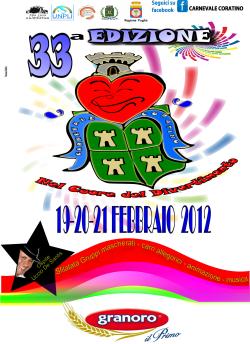 Molto ricco e coinvolgente anche il programma del Carnevale Coratino 2012 giunto quest’anno alla sua 33esima edizione, organizzato dall’Amministrazione Comunale insieme alla Pro Loco “Quadratum”. Il cartellone prevede sfilate ed esibizioni a tema. Le sfilate si svolgeranno dal 19 al 21 febbraio (tradizionale sfilata del martedì grasso) e vedranno come ogni anno, la partecipazione di numerosi gruppi mascherati coordinati dagli istituti scolastici, dalle associazioni locali, dalle parrocchie e dai privati. Tutte le sfilate partiranno da piazza XI Febbraio alle ore 15 e termineranno come di consueto in Piazza Cesare Battisti. Al termine della sfilata di martedì 21, saranno proclamati i gruppi vincitori della manifestazione 2012. Si comincia domenica 19 alle ore 15. La sfilata sarà accompagnata dagli interventi del comico Uccio De Santis e terminerà con lo show “Carnival Party” animato da deejay e musicisti.