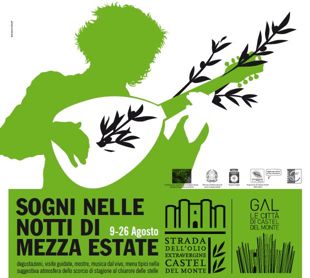 Il 26 luglio, nel Chiostro di San Francesco, alle 11, si terrà la conferenza stampa di presentazione della manifestazione. Dal 9 al 26 agosto infatti, l’offerta turistica di numerose città del territorio della provincia di Bari e di Barletta-Andria-Trani, sarà arricchita da un fitto calendario di manifestazioni enogastronomiche e culturali. “Sogni nelle notti di mezza estate” è un evento organizzato dalla “Strada dell’olio extravergine Castel del Monte” insieme al Gal “Le Città di Castel del Monte”, con il patrocinio della Regione Puglia e delle Province di Bari e di Barletta-Andria-Trani.