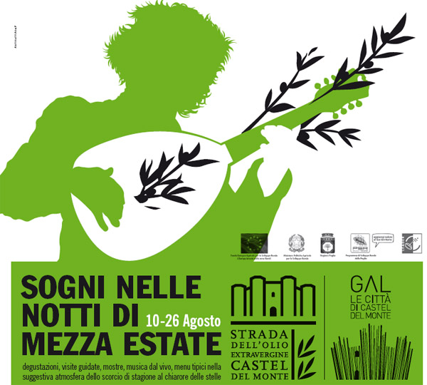 “Sogni nelle notti di mezza estate” è un evento organizzato dal Gal “Le Città di Castel del Monte” insieme alla “Strada dell’olio extravergine Castel del Monte”, con il patrocinio della Regione Puglia e delle Province di Bari e di Barletta-Andria-Trani.
