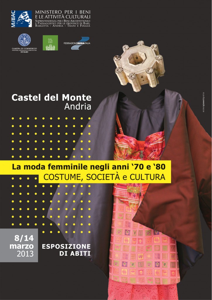 In occasione della Festa della Donna, la Soprintendenza per i Beni Architettonici e Paesaggistici per le Province di Bari, Barletta-Andria-Trani e Foggia e il GAL “Le Città di Castel del Monte”, la Camera di Commercio, Industria, Artigianato e Agricoltura di Bari e Federmoda-Confcommercio, presentano  una collezione di abiti d’epoca e, per esplorare i margini della stretta contaminazione tra moda, società, cultura ed economia, promuovono una tavola rotonda sul tema:  “La moda femminile negli anni ’70 e 80. Costume, società e cultura” che si terrà il giorno 9 Marzo 2013 a Castel del Monte – Andria (BT), a partire dalle ore 10.30.