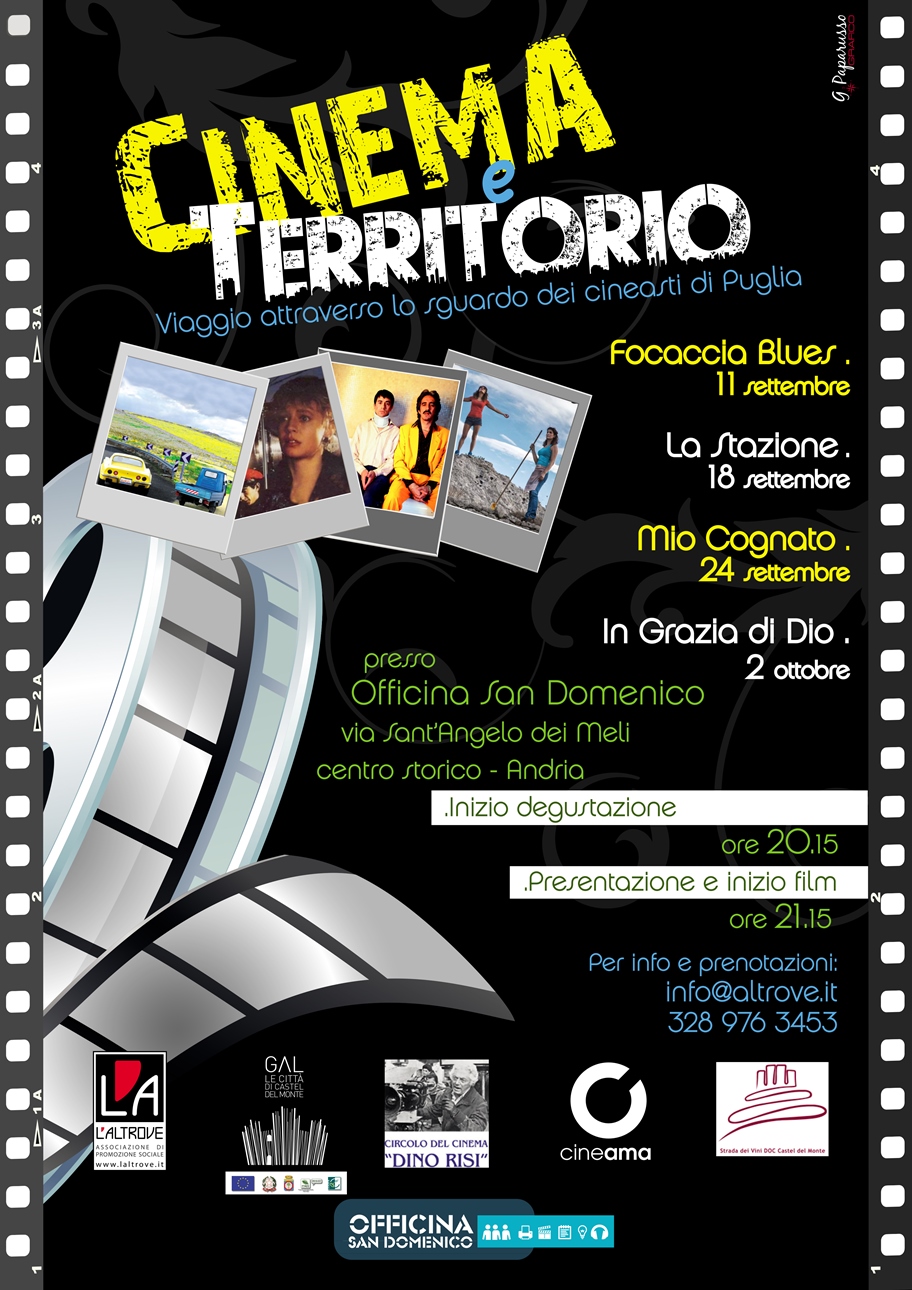 Il Gal “Le Città di Castel del Monte” in collaborazione con l’ Associazione “L’Altrove”, Il Circolo del Cinema “Dino Risi” di Trani, “Cineama” la “Strada dei Vini DOC Castel del Monte”, organizza una rassegna cinematografica intitolata “Cinema e Territorio – Viaggio attraverso lo sguardo dei cineasti di Puglia”. L’iniziativa prevede quattro appuntamenti, a partire da Giovedì 11 Settembre 2014, che si svolgeranno nello spazio esterno del Laboratorio Urbano “Officina San Domenico” (Via Sant’Angelo dei Meli 36,  Andria – Centro Storico). L’ingresso sarà possibile già dalle ore 20,15 per una degustazione di prodotti tipici del nostro territorio a cura della “Strada dei Vini DOC Castel del Monte”. Dalle 21.15, la proiezione del film, preceduta dalla presentazione di Lorenzo Procacci Leone del Circolo del Cinema “Dino Risi” di Trani, che illustrerà al pubblico le caratteristiche fondamentali del film. L’iniziativa “Cinema e Territorio” nasce dalla volontà di promuovere il nostro territorio dal punto di vista enogastronomico, socio-culturale ed economico attraverso il cinema. La rassegna sarà l’occasione per dialogare e confrontarsi sulle diverse tematiche della realtà locale passando dalle opere di quattro grandi registi: Nico Cirasola, Edoardo Winspeare, Sergio Rubini, Alessandro Piva.