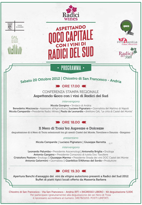 Alla conferenza parteciperanno Nicola Giorgino, sindaco di Andria, Benedetto Miscioscia, assessore al marketing e alle attività produttive della città, Paolo de Leonardis, direttore tecnico del Gal “Le Città di Castel del Monte” (partner di Qoco), Luciano Pignataro, giornalista de Il Mattino e Nicola Campanile, Presidente di “Radici Wines”, che ha organizzato l’iniziativa. Alle ore 18,30 si passerà poi alla degustazione guidata di sei diverse etichette di Nero di Troia dal titolo “Il nero di Troia tra asprezze e dolcezze”. La manifestazione si concluderà alle 19:30 con l’assaggio di piatti tipici locali e dei vini di vitigno autoctono presenti a Radici del Sud 2012.