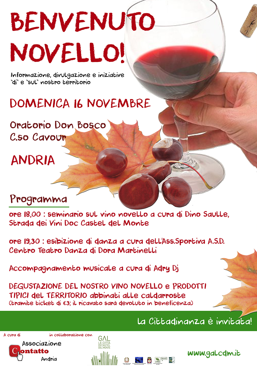 Il Gal “Le Città di Castel del Monte” in collaborazione con l’Associazione “Contatto” di Andria, organizza domenica 16 novembre, l’evento “Benvenuto Novello”, informazione, divulgazione e iniziative “di” e “sul” nostro territorio. L’inizio della manifestazione è previsto a partire dalle ore 18:00 con seminari, esibizioni e degustazioni nell’Oratorio Don Bosco in Corso Cavour ad Andria. L’ingresso è libero. Di seguito il ricco programma che prevede: