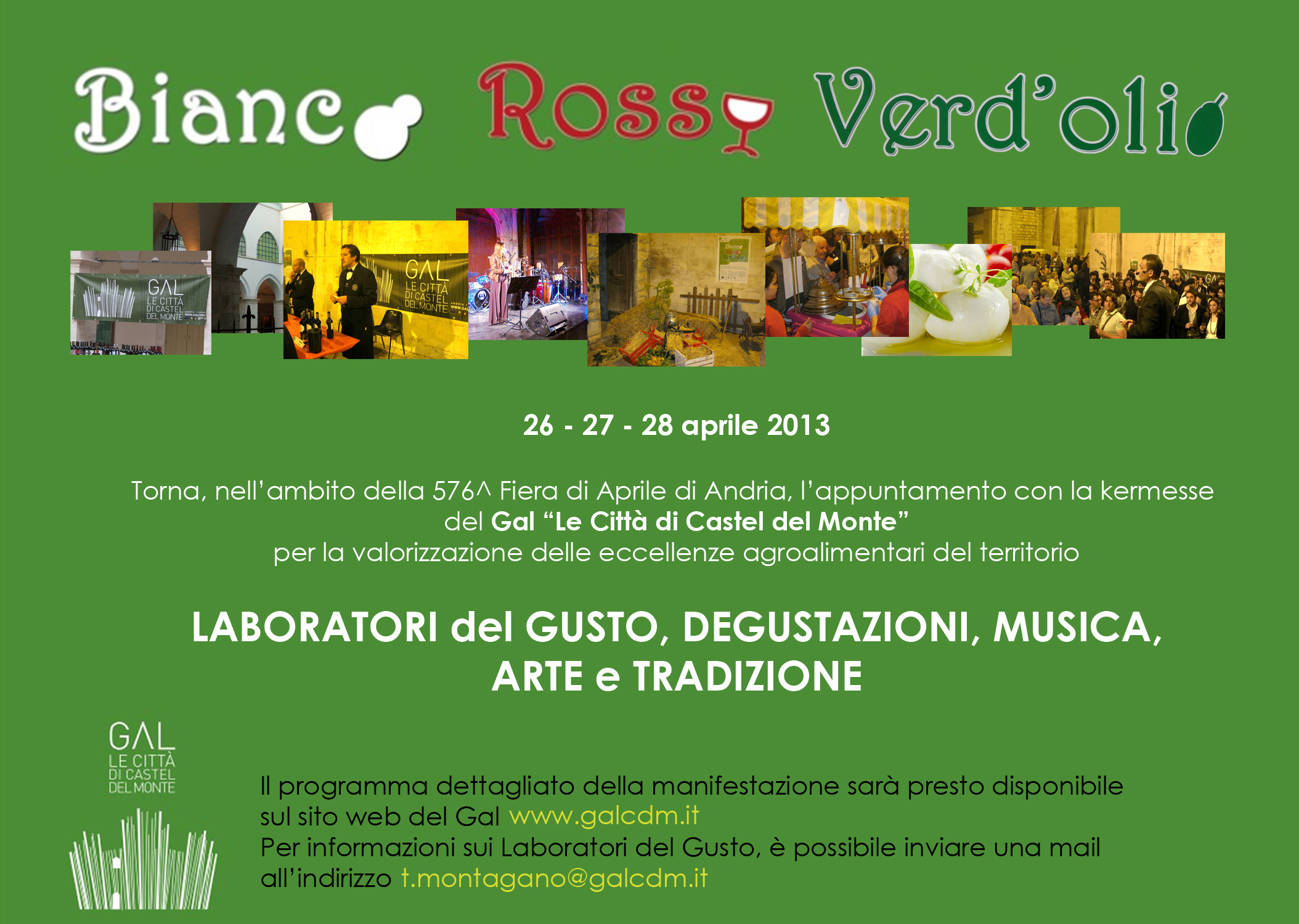Torna l’appuntamento con la kermesse dedicata alla valorizzazione delle eccellenze agrioalimentari del territorio. Dal 26 al 28 aprile 2013 nel Chiostro San Francesco di Andria, il Gal “Le Città di Castel del Monte” presenta la seconda edizione di Bianco, Rosso e Verd’olio. Tre serate dedicate ai prodotti caseari, al vino e all’olio extravergine di oliva, laboratori del gusto, musica, arte e tradizione. A breve il programma completo.