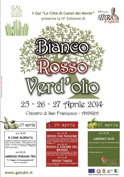 Le eccellenze agroalimentari delle aree rurali di Andria e Corato tornano alla ribalta dal 25 al 27 aprile 2014, nella terza edizione di “Bianco, Rosso e Verd’olio” kermesse organizzata dal Gruppo di Azione Locale “Le Città di Castel del Monte”, anche quest’anno collocata nell’ambito del ricco programma della 577^ Fiera d’Aprile di Andria.