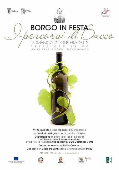 Borgo in festa per celebrare la vendemmia 2012 e la straordinaria gamma colorimetrica di un autunno ricco di sapori e suggestioni emozionali. Domenica 21 ottobre, il GAL “Le Città di Castel del Monte”, insieme alla “Strada dei vini DOC Castel del Monte”, con il patrocinio della Città di Andria, organizza un evento denominato “Borgo in Festa – i percorsi di Bacco”.