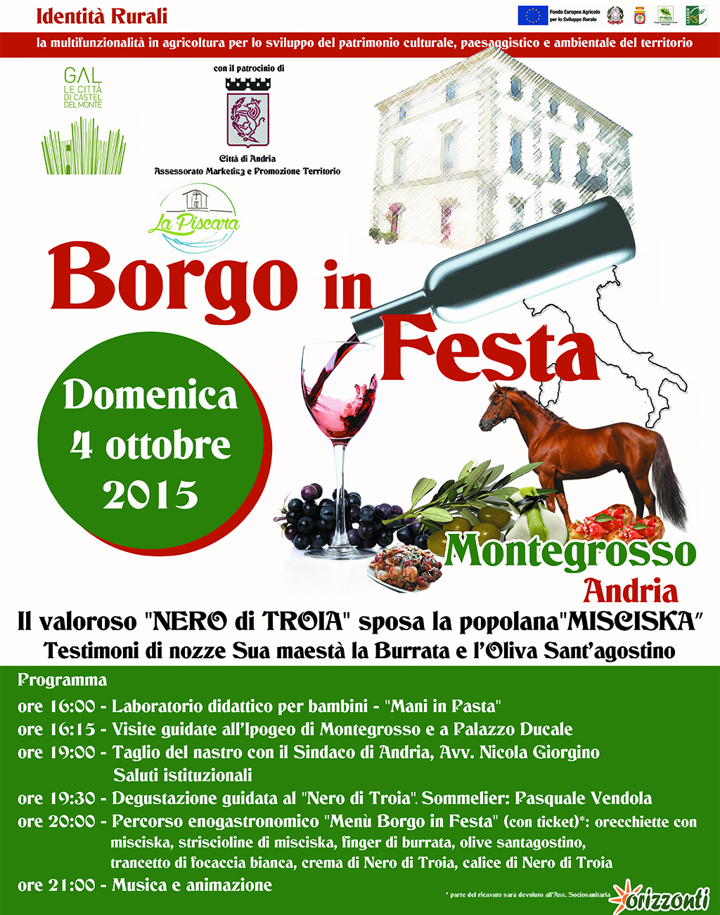Il Gal “Le Città di Castel del Monte”, con il patrocinio della Città di Andria, Assessorato al Marketing e alla Promozione del Territorio e in collaborazione con l’Ass. La Piscara, organizza domenica 4 ottobre a Montegrosso – Andria, il tradizionale appuntamento con “Borgo in Festa”. Peculiarità dell’edizione 2015 che prosegue nell’obiettivo di valorizzare le identità del territorio in chiave turistica ed enogastronomica, la “dedica” al Nero di Troia e alla misciska piatto tipico a base di carne equina.