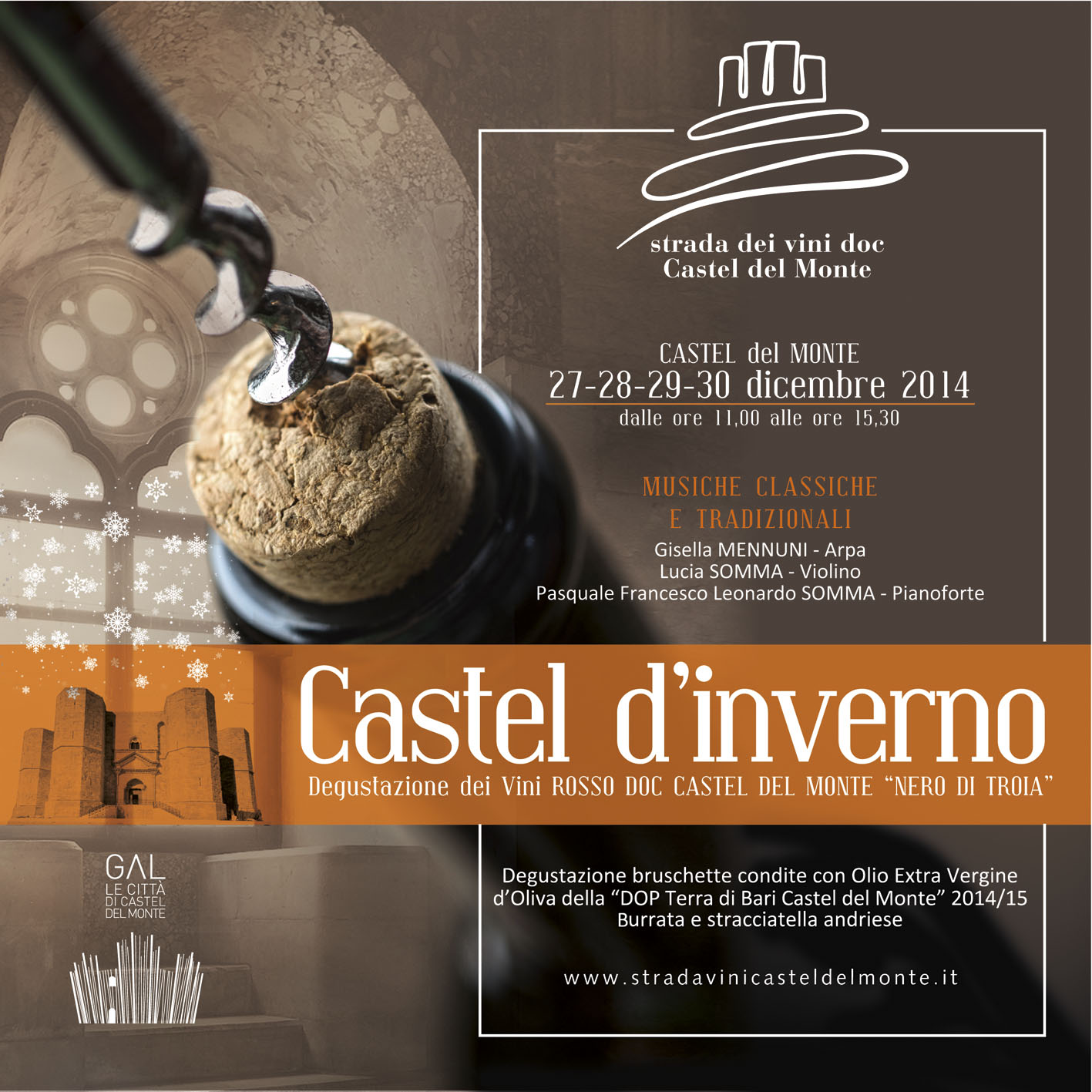Torna tra Natale e Capodanno, “Castel d’Inverno”, il format ideato dalla Strada dei Vini Doc Castel del Monte per valorizzare anche nel periodo più freddo dell’anno, le sale e le atmosfere del maniero federiciano, Patrimonio dell’Unesco. Partner e co-organizzatore dell’edizione 2014, il Gruppo di Azione Locale di Andria e Corato “Le Città di Castel del Monte” che prosegue nelle attività di promozione e valorizzazione delle eccellenze enogastronomiche, culturali e paesaggistiche del territorio.