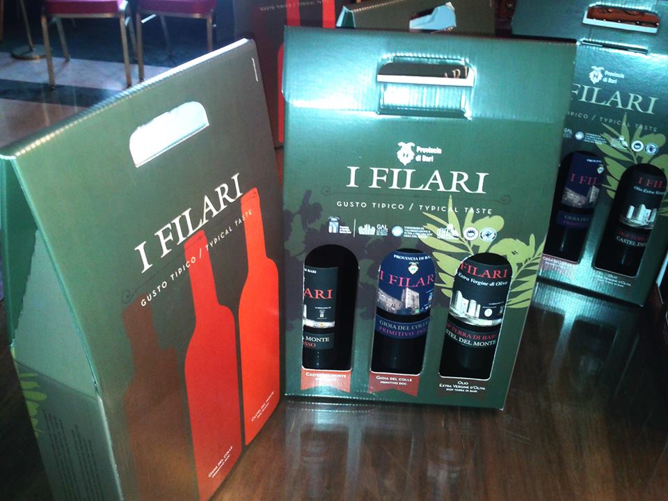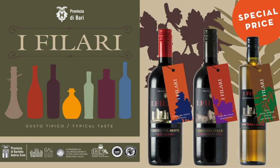 Per un’immediata riconoscibilità dei prodotti e del territorio di provenienza, è stata creata un’apposita etichetta, I FILARI, declinata su un packaging a valigetta verde, contenente tre bottiglie da 750 ml, una per ciascuna tipologia di eccellenza territoriale, che verrà commercializzata a un prezzo promozionale, per sostenere la cultura del turismo e salvaguardare e promuovere il comparto produttivo.