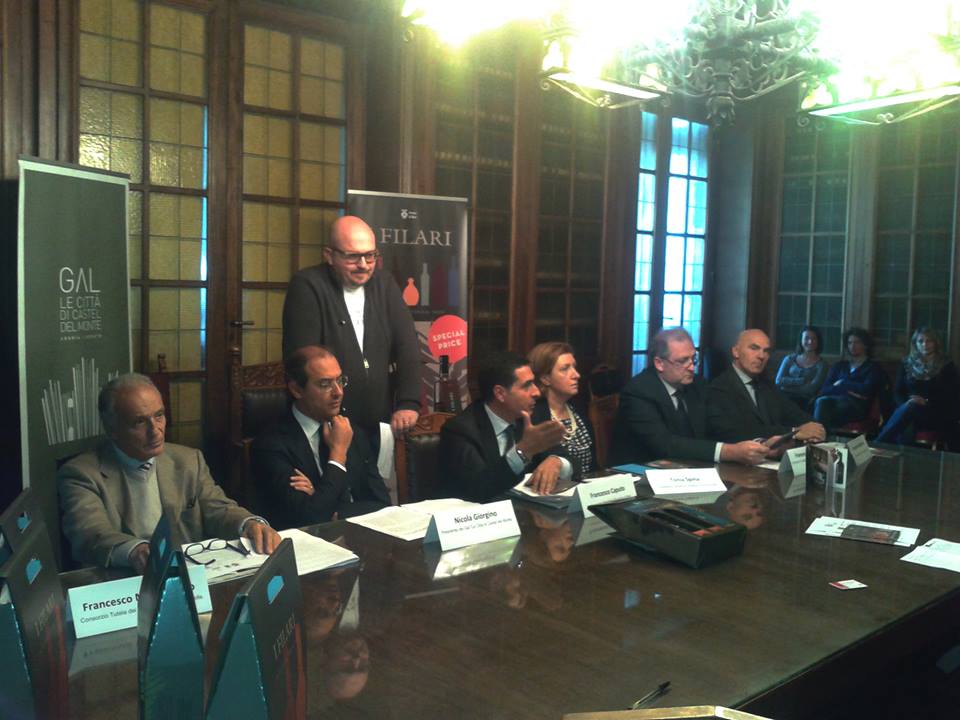 Alla presentazione sono intervenuti, il Presidente della Provincia di Bari, Dr. Francesco Schittulli, il Presidente della Provincia di Barletta-Andria-Trani, Dr. Francesco Ventola, l’Assessore Agricoltura della Provincia di Bari, Dr. Francesco Caputo, il Presidente del Gal “Le Città di Castel del Monte”, Avv. Nicola Giorgino e i rappresentanti del Consorzio di Tutela dei vini DOC Castel del Monte, del Consorzio di Valorizzazione e Tutela dei vini DOC Gioia del Colle e del Consorzio di Tutela DOP Terra di Bari.