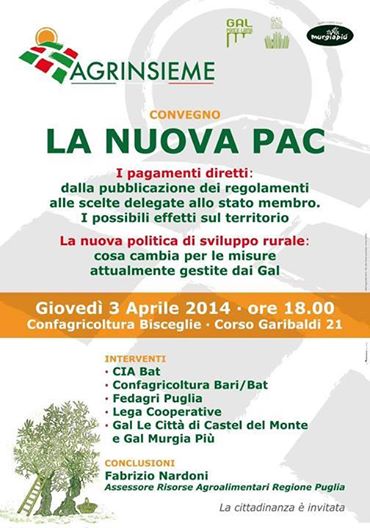 Si terrà a Bisceglie, il prossimo 3 aprile alle ore 18.00, un convegno sulla “Nuova PAC”, promosso da Agrinsieme in collaborazione con i Gruppi di Azione Locale “Le Città di Castel del Monte”, Ponte Lama e Murgia Più.