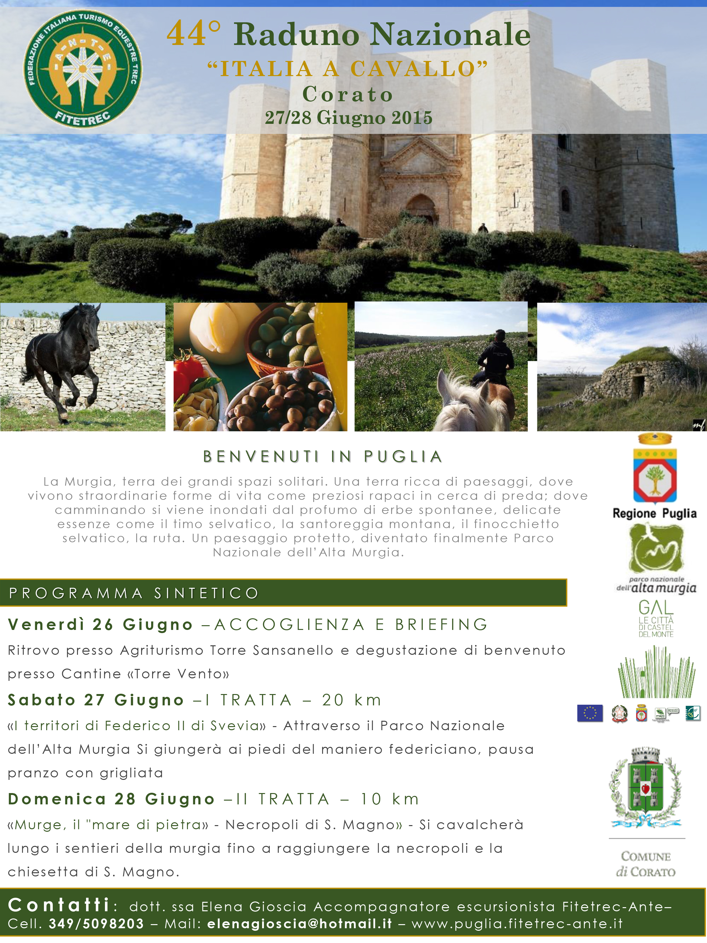 Il Gal “Le Città di Castel del Monte” è partner della tappa coratina del raduno nazionale “Italia a Cavallo”, 44^ edizione. L’ iniziativa rientra in una serie di progetti e manifestazioni volte a promuovere all’interno della nostra Regione, attraverso gli sport equestri, lo sviluppo del territorio e al contempo a divulgare l’importanza dell’avvicinamento dei giovani all’attività fisica e sportiva, elemento fondamentale per la salute dell’individuo, ottenibile prioritariamente attraverso il contatto e la conoscenza del cavallo. Il progetto intende promuovere lo scambio di buone prassi e lo sviluppo di nuove competenze professionali nel settore dell’Ippoturismo, turismo ecocompatibile per eccellenza, grazie al quale si può ottenere una crescita, in termini sia numerici che di qualità, dell’offerta delle attività di turismo rurale, agriturismo, turismo verde e sportivo, nonché del “turismo di scoperta” di quella così chiamata “Italia minore”, con i suoi B&B, Centri Equestri, Cantine e Ristorazione Tipica.