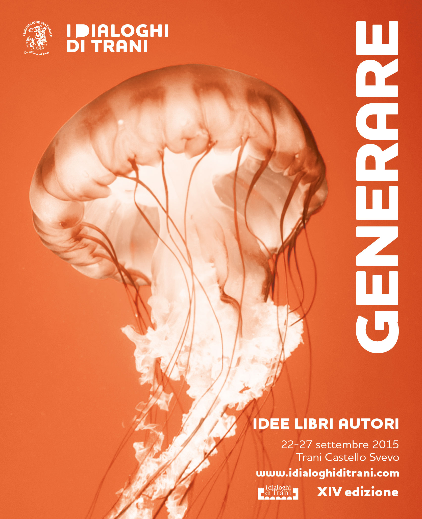 locandina DdT 2015Si terrà dal 22 al 27 settembre nel Castello Svevo di Trani, l’edizione 2015 de “I Dialoghi di Trani” tra i più importanti festival culturali della Puglia e del Mezzogiorno organizzato dall’Associazione “La Maria del Porto”. Prestigiose, anche quest’anno le partnerrship e le collaborazioni. Tra queste quella dell’Assessorato al Mediterraneo, Cultura e Turismo della Regione Puglia, del Comune di Trani, del Comune di Corato, del Comune di Molfetta, dei Gruppi di Azione Locale “Le Città di Castel del Monte” Andria – Corato e “Ponte Lama” Bisceglie – Trani.