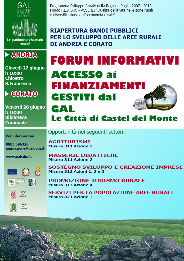 Il Gal “Le Città di Castel del Monte”, in occasione della riapertura dei bandi pubblici per lo sviluppo delle aree rurali di Andria e Corato, organizza due forum informativi aperti alla cittadinanza, nelle seguenti date: