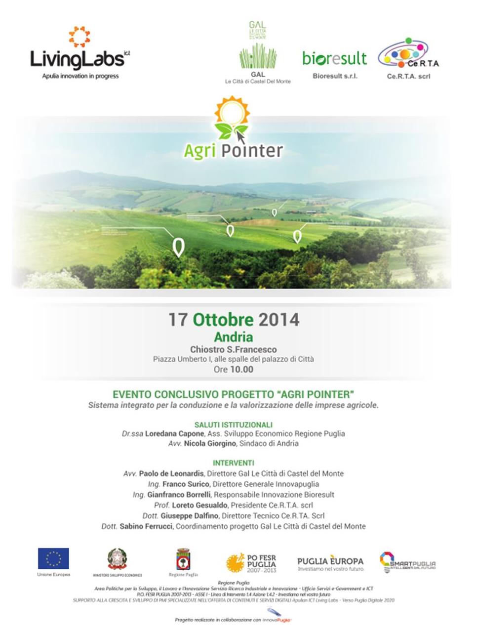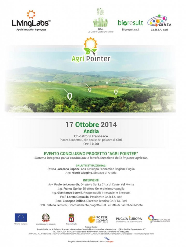 Venerdì 17 ottobre alle ore 10 presso il Chiostro S.Francesco di Andria, si terrà l’evento conclusivo del progetto Agri Pointer, realizzato nell’ambito degli Apulian Living Labs della Regione Puglia (P.O. FESR 2007 – 2013) Area per lo Sviluppo, Lavoro e Innovazione con la collaborazione di Innovapuglia Spa.
