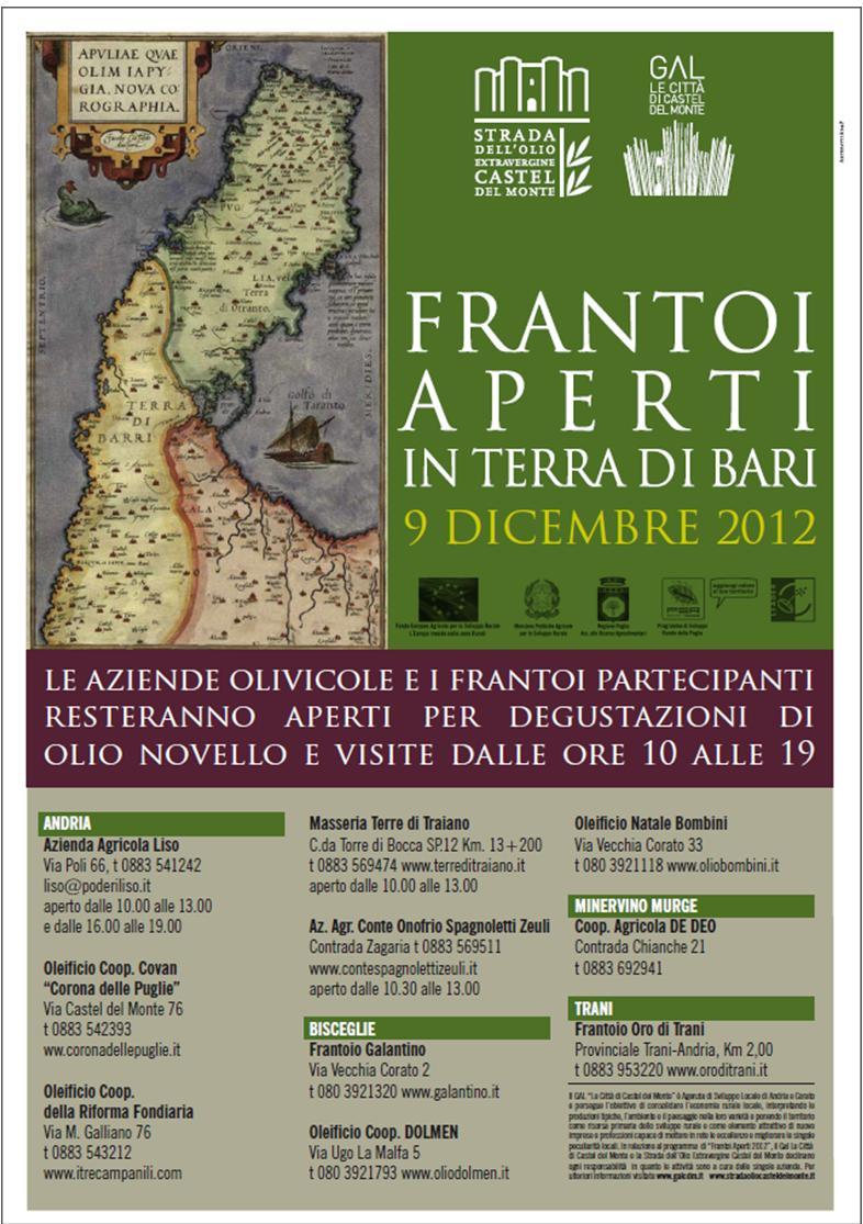 Di seguito è possibile visionare il programma completo dell’edizione 2012 di “Frantoi Aperti”, con i riferimenti delle aziende che prendono parte all’iniziativa. Appuntamento a domenica 9 dicembre.