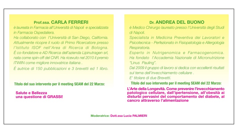 L’incontro si terrà nell’auditorium del Liceo Artistico Federico II Stupor Mundi di Corato, il 22 marzo 2014 alle ore 17:30. Interverranno la prof.ssa Carla Ferreri che relazionerà sul tema “Salute e Bellezza una questione di GRASSI!” e il prof. Andrea Del Buono che tratterà il tema “L’Arte della Longevità. Come prevenire l’Invecchiamento patologico cellulare, dall’ipertensione, all’obesità ai disturbi pervasivi del comportamento del diabete, al cancro attraverso l’alimentazione”.