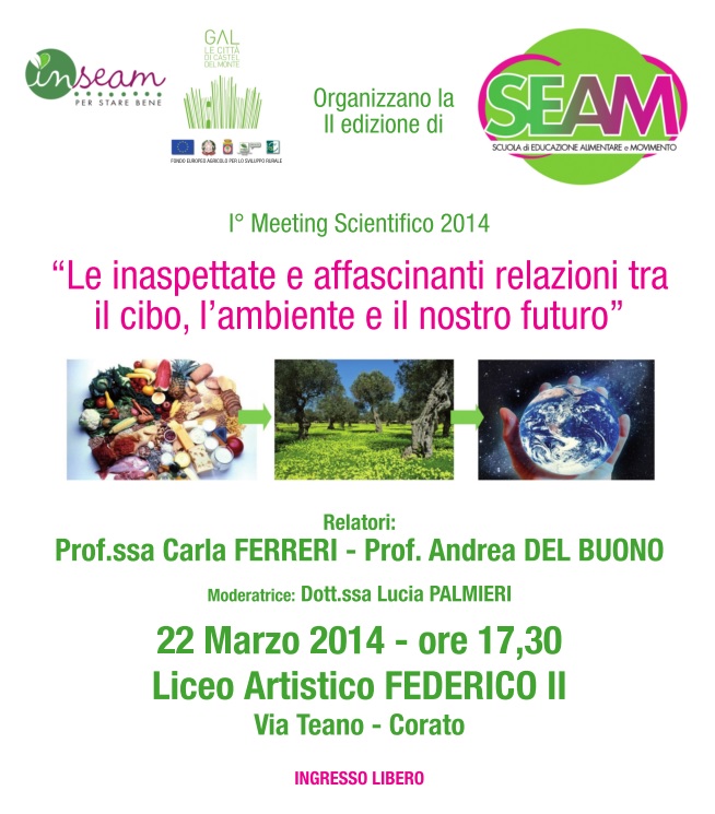 Il Gal “Le Città di Castel del Monte” e l’Associazione INSEAM organizzano a Corato il I° meeting scientifico tragato S.E.A.M. dal titolo “Le inaspettate e affascinanti relazioni tra cibo, l’ambiente e il nostro futuro”. Il meeting rientra nelle attività della seconda edizione della SEAM, Scuola di educazione alimentare e movimento per adulti.