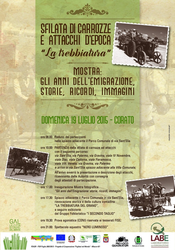Nell’ambito del Progetto di Cooperazione “Pugliesi nel Mondo”, il Gal “Le Città di Castel del Monte”, in collaborazione con Comune di Corato e Pro Loco Quadratum, organizza per domenica 19 luglio nello spazio adiacente il Parco Comunale di Via S.Elia, eventi e attività legate al tema: “Gli anni dell’emigrazione: storie, ricordi, immagini”.