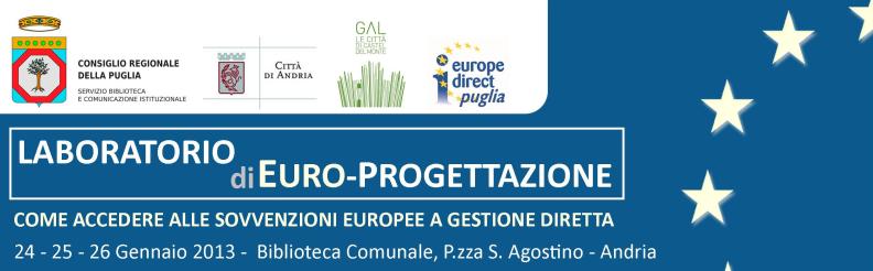 Si terrà ad Andria, nei giorni 24-25-26 gennaio 2013, dalle ore 9.00, nella Biblioteca Comunale, il primo laboratorio teorico-pratico dedicato alla progettazione europea destinato ad amministratori e dipendenti EELL ai vari livelli, personale delle Pubbliche Amministrazioni e dell’Università, operatori e dipendenti di Agenzie di Sviluppo locale, Associazioni di categoria, Associazioni di volontariato, ONG e Associazioni di Promozione sociale, Liberi Professionisti e Imprese.