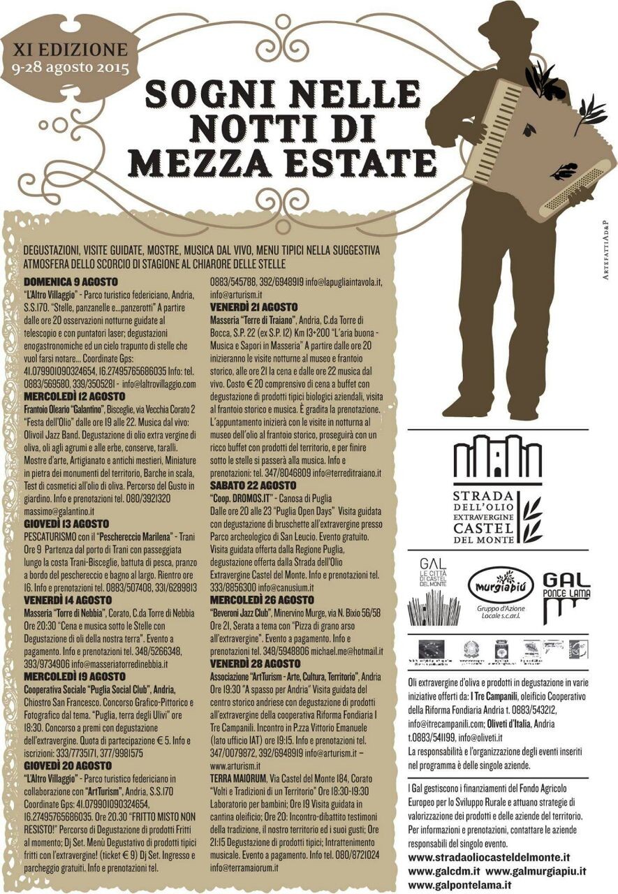 “Sogni nelle notti di mezza estate” è un evento organizzato dalla “Strada dell’olio extravergine Castel del Monte” in collaborazione con i Gruppi di Azione Locale “Le Città di Castel del Monte”, “Murgia Più” e “Ponte Lama”.