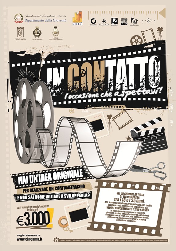 Il Gal “Le Città di Castel del Monte”, segnala il progetto “In Contatto”, iniziativa a sostegno della creatività giovanile per la creazione di opere audiovisive low budget, che prevedano l’utilizzo delle nuove tecnologie multimediali e la cooperazione tra giovani artisti e pubblici di riferimento. In Contatto, è un progetto promosso da ANCI e dal Dipartimento della Gioventù della Presidenza del Consiglio dei Ministri, a sostegno della “Creatività Giovanile”.
