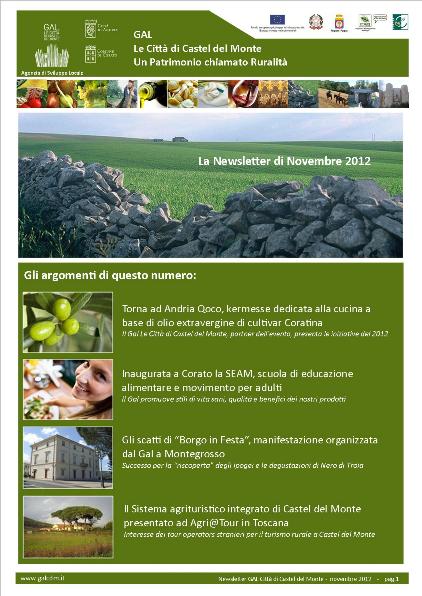 E’ possibile scaricare la newsletter di novembre 2012 del gruppo di azione locale “Le Città di Castel del Monte” di Andria e Corato.