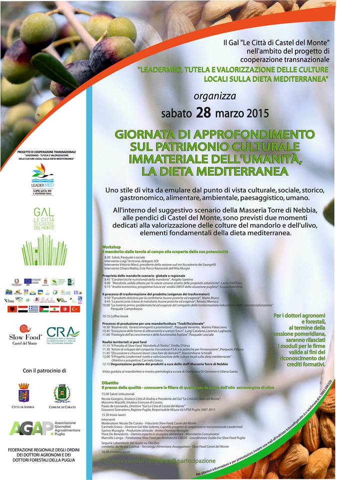 Il Gal “Le Città di Castel del Monte” nell’ambito del progetto di cooperazione transnazionale “LEADERMED, TUTELA E VALORIZZAZIONE DELLE CULTURE LOCALI SULLA DIETA MEDITERRANEA” organizza sabato 28 marzo 2015, la “Giornata di approfondimento sul Patrimonio Culturale Immateriale dell’Umanità, la dieta mediterranea”, uno stile di vita da emulare dal punto di vista culturale, sociale, storico, gastronomico, alimentare, ambientale, paesaggistico, umano.