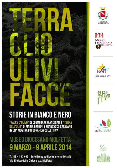 Il Gal “Le Città di Castel del Monte”, nell’ambito delle proprie attività di promozione delle eccellenze del comparto agroalimentare di Andria e Corato, in accordo con le linee programmatiche del proprio Piano di Sviluppo Locale, intende condividere con il territorio, la partecipazione all’evento “Terre, Olio, Ulivi, Facce” che presenterà una mostra fotografica del Maestro Cosmo Mario Andriani, Maria Pansini e Francesco Catalano, presso il Museo Diocesano di Molfetta.