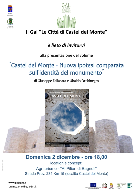 Il Gal “Le Città di Castel del Monte” è lieto di invitarvi alla presentazione del volume “Castel del Monte – Nuova ipotesi comparata sull’identità del monumento” di Giuseppe Fallacara e Ubaldo Occhinegro. Domenica 2 dicembre, ore 18:00, Agriturismo “Ai Pilieri di Bagnoli”.