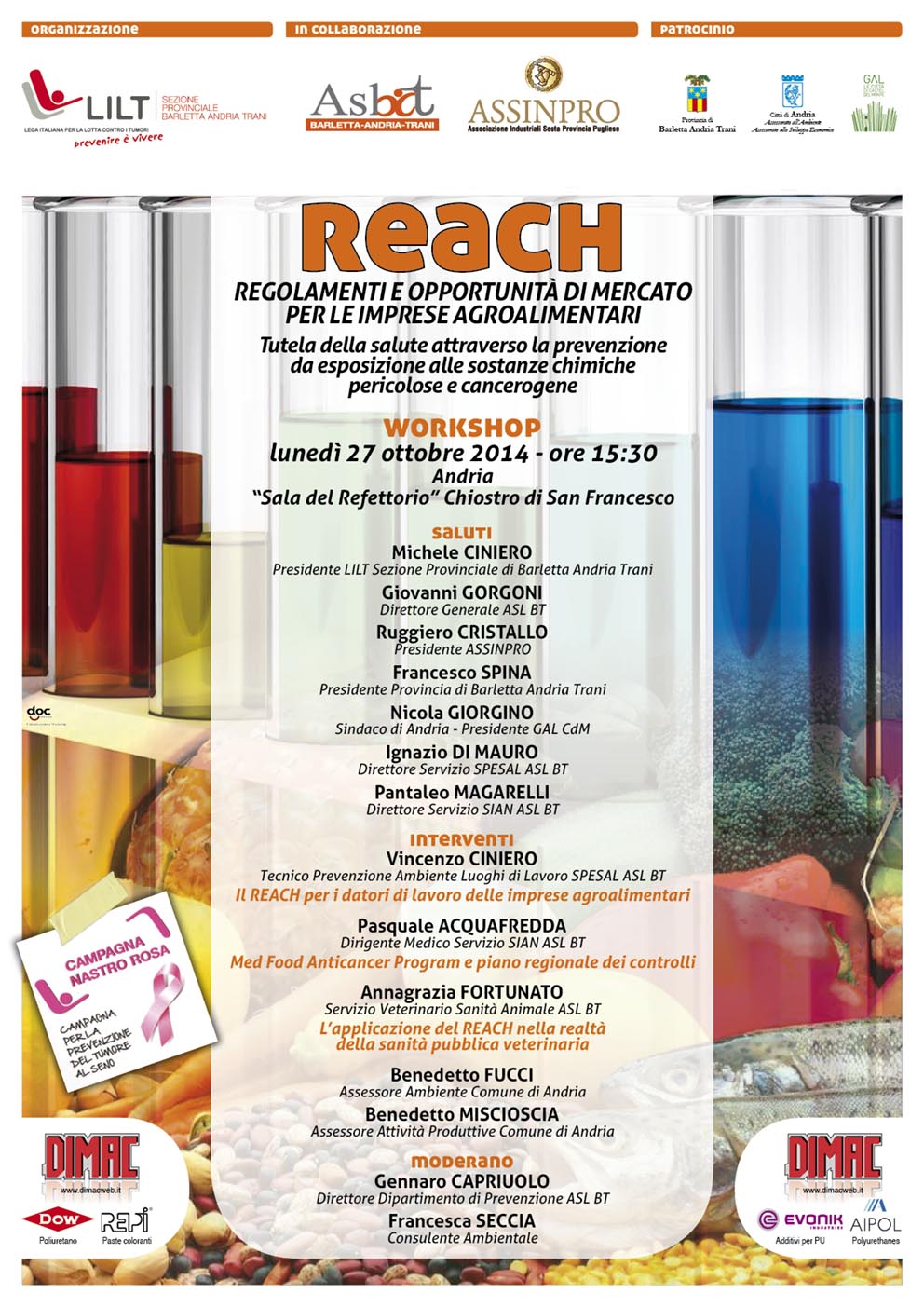 Lunedì 27 ottobre dalle ore 15,30 nella sala conferenze del Chiostro di San Francesco ad Andria, si terrà il workshop dal titolo “REACH” Regolamenti e Opportunità di mercato per le Imprese Agroalimentari.