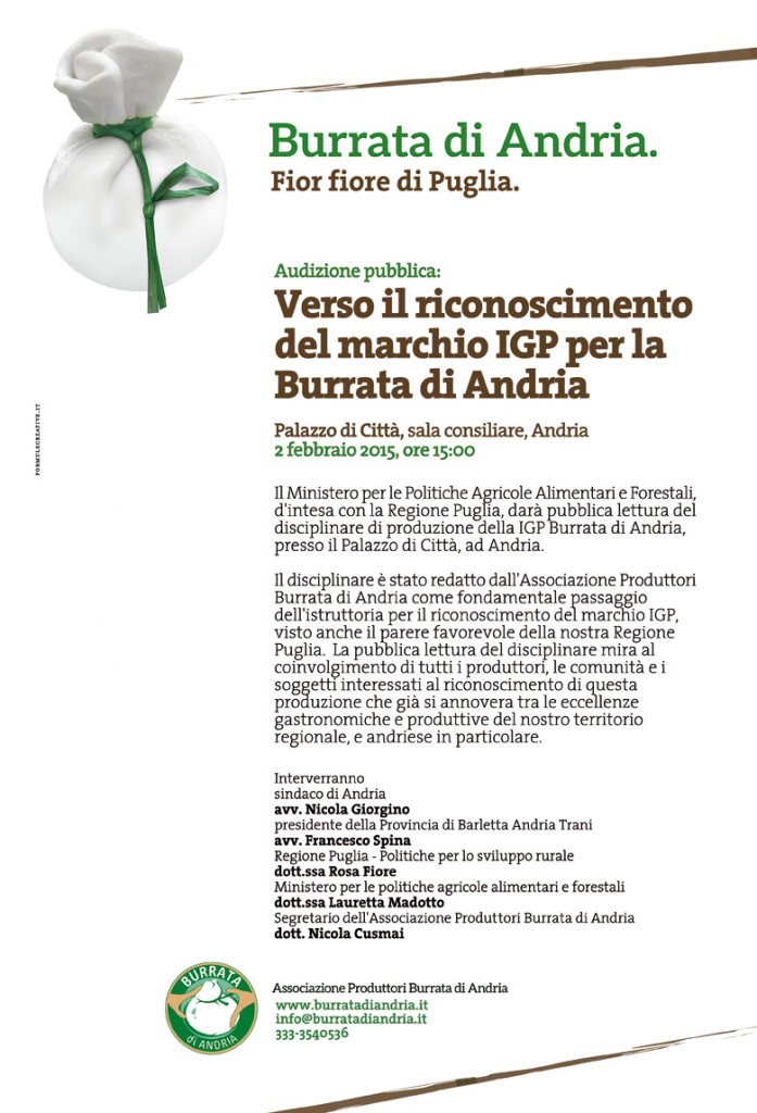Si informa che il Ministero per le Politiche Agricole Alimentari e Forestali, d’intesa con la Regione Puglia, il giorno 2 febbraio alle ore 15:00, presso il Palazzo di Città, sala consiliare – in piazza Umberto I – Andria BT, darà pubblica lettura del disciplinare di produzione della IGP Burrata di Andria. L’iter è stato sostenuto anche dal Gal “Le Città di Castel del Monte” attraverso iniziative e attività di promozione a favore del riconoscimento (vedi nota su Cheese 2013).