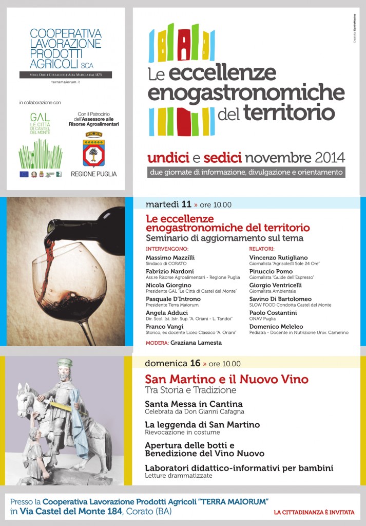 Il Gal “Le Città di Castel del Monte” è partner della Cooperativa Lavorazione Prodotti Agricoli di Corato nell’ambito dell’evento “Le eccellenze enogastronomiche del territorio”, organizzato nelle giornate dell’ 11 e 16 novembre nella storica sede della cantina di Via Castel del Monte 184. L’iniziativa prevede attività finalizzate a discutere, informare e fare il punto sulle strategie locali di promozione delle eccellenze enogastronomiche e a valorizzare tradizioni e memorie legate alle attività agricole. Gli eventi godono del patrocinio istituzionale dell’Assessorato alle Risorse Agroalimentari della Regione Puglia e prevedono martedì 11 novembre, un seminario di aggiornamento sul tema con l’intervento dell’Assessore Regionale Fabrizio Nardoni, del Sindaco di Corato Massimo Mazzilli e del Presidente del Gal “Le Città di Castel del Monte” Nicola Giorgino. Insieme a loro interverranno il Presidente della Cooperativa Pasquale D’Introno oltre ad esperti nel settore della nutrizione, della formazione e dell’enogastronomia. Domenica 16 novembre a partire dalle ore 10, spazio a storia e tradizione legate al vino novello con la santa messa in cantina, la rievocazione in costume della Leggenda di San Martino, l’apertura delle botti e la benedizione del “vino nuovo” e i laboratori didattici per i bambini. Ingresso e partecipazione sono liberi.