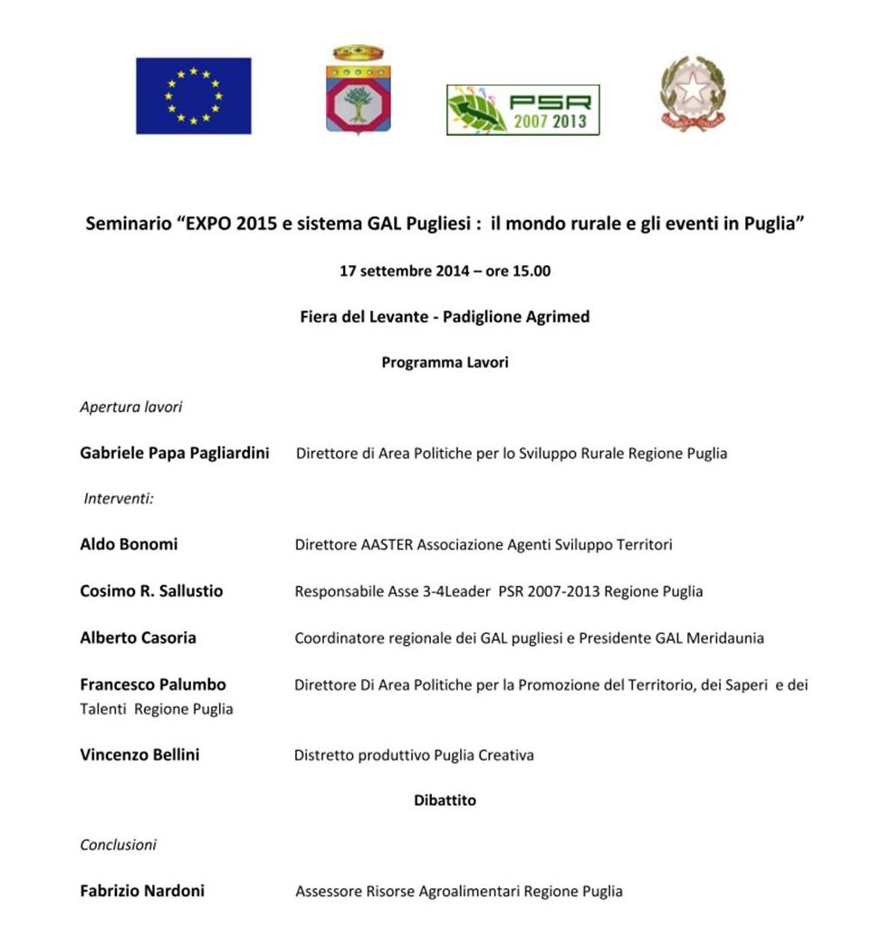 Si terrà mercoledì 17 settembre alle ore 15:00 nel Padiglione Agrimed della Fiera del Levante, il seminario “EXPO 2015 e sistema GAL Pugliesi: il mondo rurale e gli eventi in Puglia”. I lavori, aperti dal Dott. Gabriele Papa Pagliardini, Direttore Area Politiche per lo Sviluppo Rurale della Regione PUglia, saranno conclusi dall’Assessore regionale alle Risorse Agroalimentari, Fabrizio Nardoni. Di seguito il programma completo.