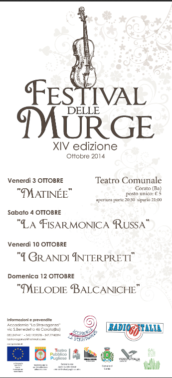 Il Gal “Le Città di Castel del Monte”, nell’ambito delle proprie attività finalizzate alla valorizzazione del patrimonio culturale e artistico del territorio, è partner anche quest’anno del Festival delle Murge, giunto alla XIV edizione. Ricco e variegato il programma della kermesse musicale che si svolgerà all’interno dello storico Teatro Comunale di Corato.